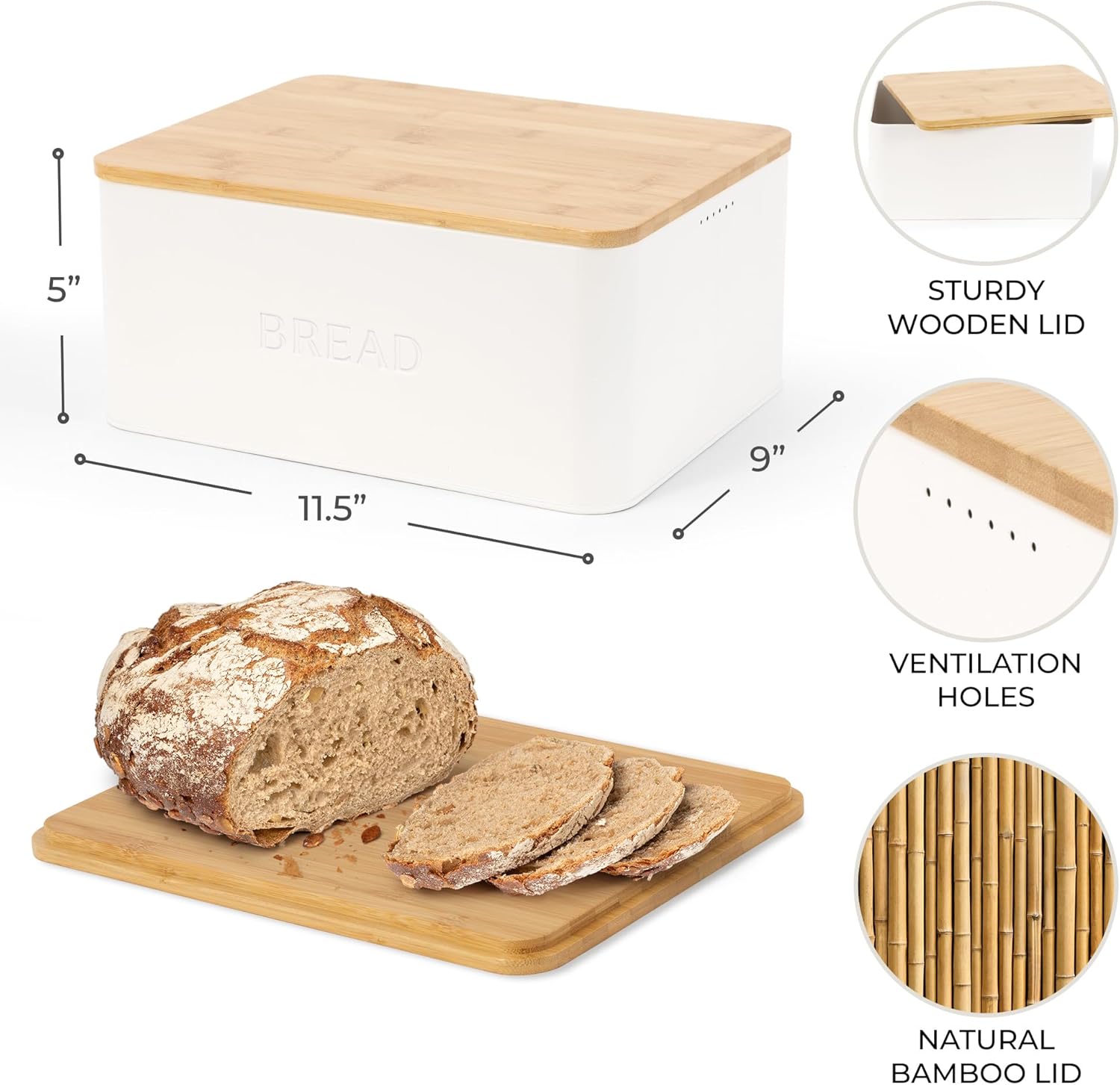Introducing our Beautiful Bread Box with Wooden Lid, the perfect addition to your kitchen countertop! This spacious container is designed to perfectly store your homemade bread, English muffins, bagels, and more, keeping them fresh and delicious for longer periods of time.